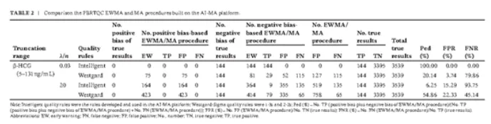 Hoffman 和 Waid早在 1965 年就建議將PBRTQC AON 法用于臨床檢測的補充質(zhì)量控制方法,但許多臨床實驗室并未使用這種方法,主要是因為建立這些特定程序被認為很復(fù)雜, 而且如果沒有特定功能的軟件,就無法在實踐中應(yīng)用。但鑒于母體血清篩查的重要性,在本研究中首次嘗試利用人工智能軟件構(gòu)建一個PBRTQC程序,以持續(xù)監(jiān)測母體血清篩查的檢測質(zhì)量, 從而通過與室內(nèi)質(zhì)量控制方法相結(jié)合來提高母體血清篩查的檢測準確性。