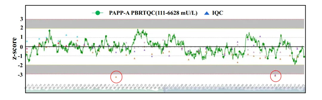 圖4:PAPP-A 室內(nèi)質(zhì)控(IQC)失控點在 z 分數(shù)圖中的展示,由紅圈標記的三角形表示 IQC 的失控點。