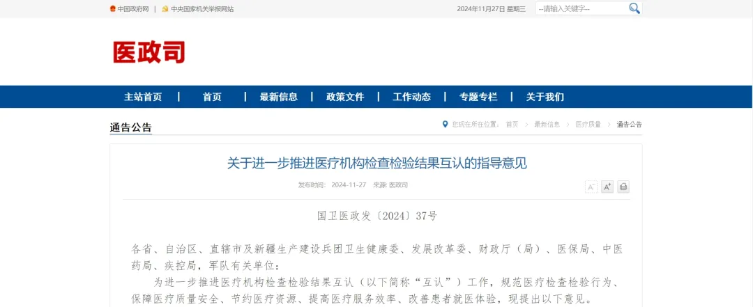 通知發(fā)布 2024年11月27日,國家衛(wèi)生健康委、國家發(fā)展改革委、財政部等7部門公布《關于進一步推進醫(yī)療機構檢查檢驗結果互認的指導意見》,要求以保障質量安全為底線、以接診醫(yī)師判斷為標準,推進檢查檢驗結果互認工作,提高醫(yī)療服務效率,改善患者就醫(yī)體驗。 森栩醫(yī)學對《指導意見》全文重要內容進行解讀并提供專業(yè)的基于AI+5G的醫(yī)療機構檢驗結果互認實時智能監(jiān)控平臺(AI-HR)整體解決方案,助力醫(yī)療機構檢查檢驗結果互認。